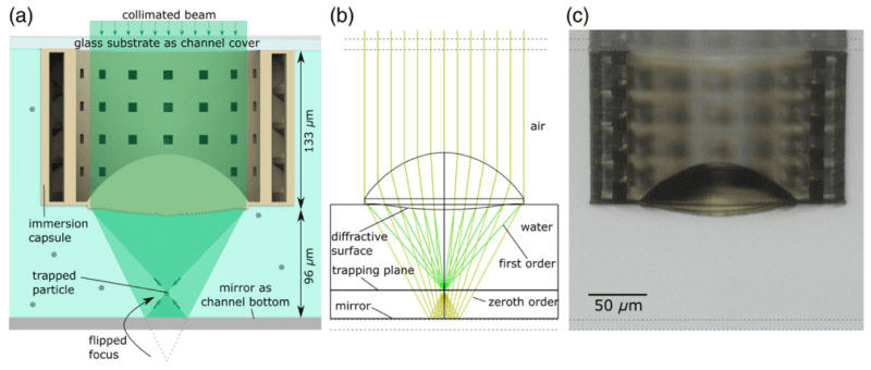 На рисунку 1 зображено: (a) 3D-надруковану іммерсійну лінзу на скляній підкладці, змонтовану навпроти частково відбивного дзеркала. Разом вони утворюють вузький канал. Гібридна рефракційно-дифракційна поверхня лінзи створює два аксіально рознесені фокуси, які точно суміщуються дзеркалом для формування контрпропагуючої пастки. (b) Оптичну схему голографічної twin trap пастки. (c) Мікроскопічне фото секційного друку системи