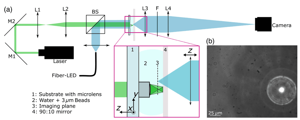На рисунку 2 зображено: (a) Схему експериментальної установки та збільшений вигляд області підкладки. Мікролінза на підкладці освітлюється колімованим лазерним світлом. Точні регулювання використовуються для позиціонування лінзи відносно дзеркала та захоплюваних частинок. Яскравопольне освітлення дозволяє спостерігати процес захоплення через напівпрозоре дзеркало. (b) Зображення, отримане за допомогою експериментальної установки: видно сфокусований перший порядок і розфокусований нульовий порядок, а також полістиролові частинки у воді.
