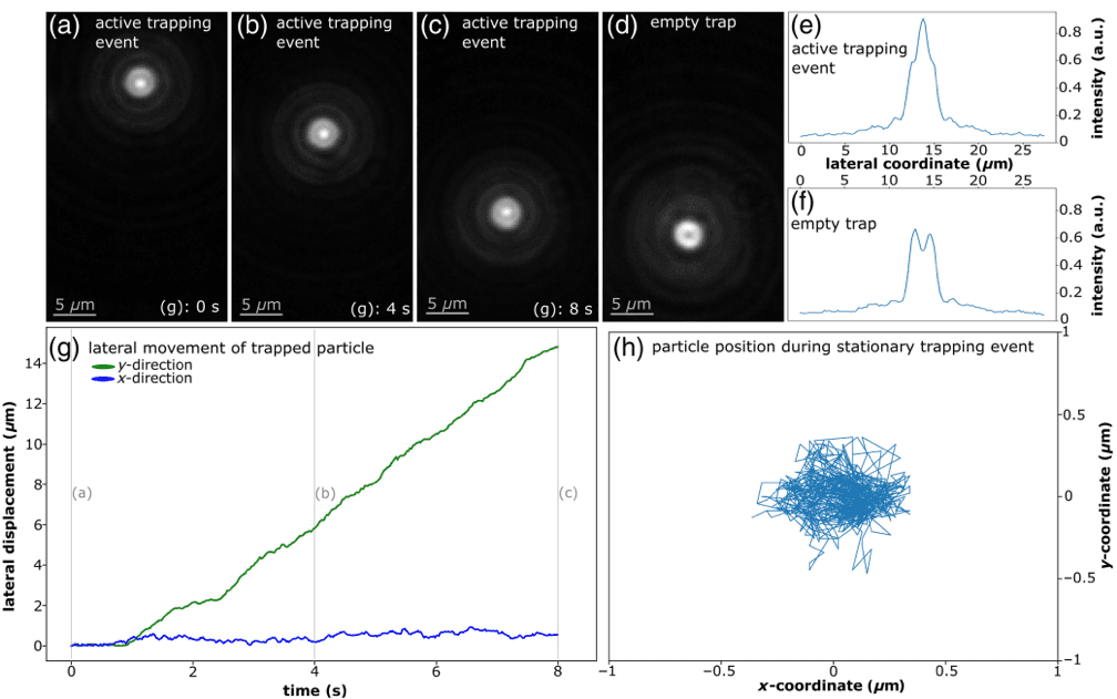 На рисунку 4 зображено: (a–c) Послідовні кадри експерименту, що демонструють успішне поперечне переміщення захопленої 3-мікрометрової полістиролової частинки. (d) Зображення оптичної пастки без частинки. (e–f) Горизонтальні зрізи через центр пастки, що відповідають кадрам (a) та (d). (g) Поперечне зміщення захопленої частинки в часі по осях x та y. (h) Визначене положення частинки на основі 1000 послідовних кадрів за 10 секунд.